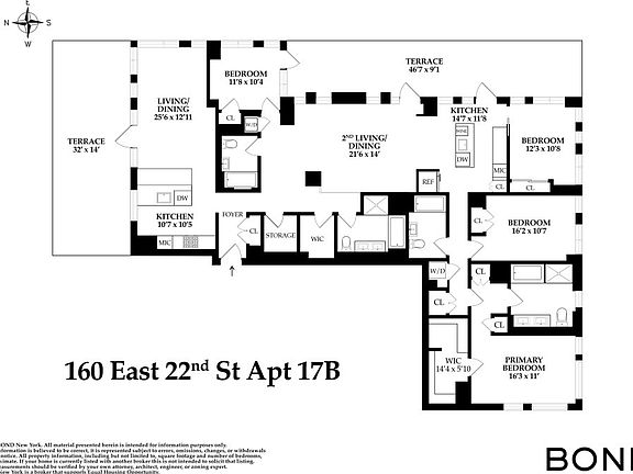 Amazing sundrenched four-bedroom four full baths apartment available for lease. Moments from Gramercy Park and the Flatiron District. Over 2750 SF of interior space, plus TWO 450 SF private terrace ideal for fun and entertaining guests. This extraordinary city home is equipped with two sets of washer & dryer, and there are two walk-in closets and a large storage room. The living room and the dining area feature floor to ceiling windows with amazing views. The apartment is built with two kitchens (one has no cooking feature). Both have a center stone island with abundant cabinet and pantry space as well as high-end appliances: Miele Cooktop and convection Oven, Subzero fridge, Wine Cooler, and Miele Dishwasher. The Primary Bedroom has a south & west exposure and includes a substantial walk-in closet / storage and an en-suite oversized marble bathroom with double vanity, a glass-enclosed rain shower, a deep spa bathtub. Well-appointed second and third bedroom also have southern exposure. The fourth bedroom has a door connected to the terrace and it has an eastern exposure. 160 East 22nd Street is a luxury condominium with a full time doorman, a state of the art Fitness Center, 's Playroom, Cold Storage, and a landscaped Roof Deck with an outdoor kitchen and panoramic city views. Gramercy Park is one of Manhattan's most exciting and sought after neighborhoods. This full-service building is conveniently located to transportation, Gramercy Park, Union Square Farmer's Market, Madison Square Park, shopping and incredible restaurants. Please contact listing agent for showing appointments. BOND New York Properties is a licensed real estate broker that proudly supports equal housing opportunity.