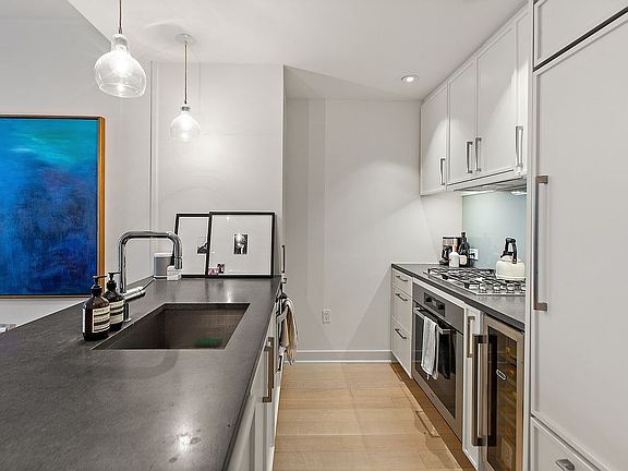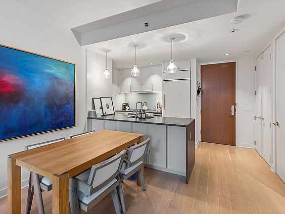 Apartment highlights: Open chef's kitchen. Top of the line appliances: Sub-Zero refrigerator, Miele oven, cooktop, microwave drawer, dishwasher, wine chiller, Bosch washer and dryer. Five-inch white oak floors. Wall of double-pane windows maintains serenity within.
