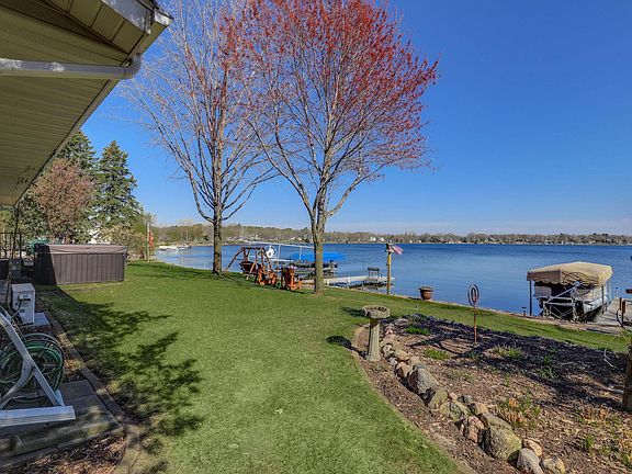 LAKE LIVING AT ITS FINEST! Well manicured, level lot with approx 75 feet of sandy lakeshore! Fully remodeled home using a well-thought-out design focusing on lake views and the joy of entertaining. Gorgeous kitchen with custom alder cabinetry, granite countertops, backsplash, huge center island to gather around, skylight offering additional natural light, slate appliances and a small nook which could be a great location for your very own coffee bar. New flooring and paint throughout, updated electrical, 3 bedrooms on the main level including a large primary with amazing lake views, stone fireplace in the living room, large dining area and a custom-built wet bar to gather with friends and family after a busy day at the lake. Lower level adds additional space with a family room, flex room, large laundry room and ¾ bath. Tons of storage here also. Oversized 3 car garage, fully finished, heated and has a ½ bath. What a great feature when you are spending the day at the beach! Large concrete driveway with an extra parking area, additional outside storage, maintenance free deck, gorgeous landscaping, in-ground sprinklers, steel siding and a new roof. Every inch has been meticulously cared for - be prepared to FALL IN LOVE! Summer is almost here - DON'T MISS THIS OPPORTUNITY!