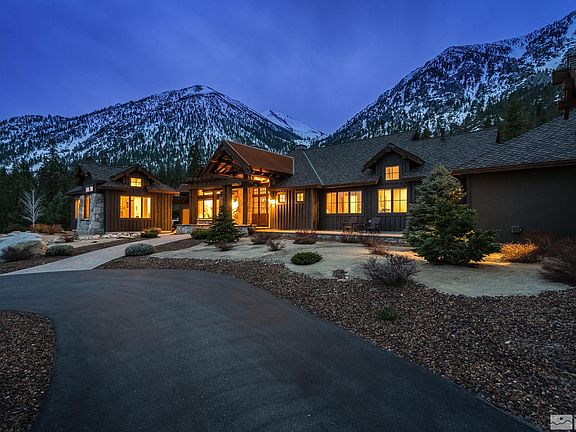 Searching for an impeccable Gardnerville retreat that's like no other? Ready for you to move in, unpack, and relax, this inspired haven - exquisitely crafted - combines striking natural elements with modern features and endless views! Majestic mountains serve as a picture-perfect backdrop for a magnificent home defined by rustic accents., The 4,183-sq ft main residence and 513-sq ft casita collectively offer four bedrooms, four and a half baths, each bedroom boasts an ensuite walk in shower. Perfectly placed on an elevated 5.06-acre lot in the desirable Jobs Peak Ranch community. A pergola-covered porch invites you to explore a handsome interior drenched in natural light by large windows that frame sensational panoramas. Wood graces everything from the built-ins to the living room's soaring exposed truss and beam ceiling. Curl up with a good book and a cup of coffee by the raised-hearth fireplace with stone surround. Also keeping you warm on cold days is a hydronic floor heating system throughout. Natural wood plank tiles induces an inviting ambiance. Prepare to be wowed by an open gourmet kitchen featuring knotty alder cabinetry, KitchenAid double ovens and dual dishwashers, and a Viking 8-burner gas cooktop and griddle. A chic backsplash complements smooth and chiseled edge granite countertops that extend to the multi-seater island. Treat yourself to stellar scenery while sharing meals in the adjacent sunlit dining room. Barn doors reveal a stately den highlighting a library where bibliophiles can showcase their favorite books. Sure to be a popular hangout spot, a walk-out bonus room has a wet bar and dual-beverage fridge. Retire to your luxurious primary bedroom to enjoy outdoor access, a double-sided fireplace, and stunning scenes of snow-capped peaks. Pamper yourself in its elegant ensuite walk-in shower and free-standing soaking tub. Outside, you can avail of a fully enclosed garden area ideal for unwinding, a glowing gas fire pit, and a built-in BBQ with a rotisserie that comes in handy for summer cookouts with countertop fire pit. This custom stunner offers a dedicated space for overnight guests. A separate casita offers a bedroom and full bath separated from the sitting area and kitchenette by a two-sided gas fireplace. With an amazing location near the California border, you can soak up sweeping perspectives of gorgeous Carson Valley and the Eastern Sierra Nevadas or delight in the unobstructed vistas of Jobs Peak. If you happen to be passionate about animals, you're in luck. You can witness nearby efforts to facilitate wildlife preservation and deer migration. Other perks include a 4-car garage, drip irrigation system, surround sound, and sensor hallway lighting. Only minutes from Lake Tahoe, Heavenly and Kirkwood Ski Resort; Why just read about this fantastic gem? Come for a tour before the opportunity passes you by!