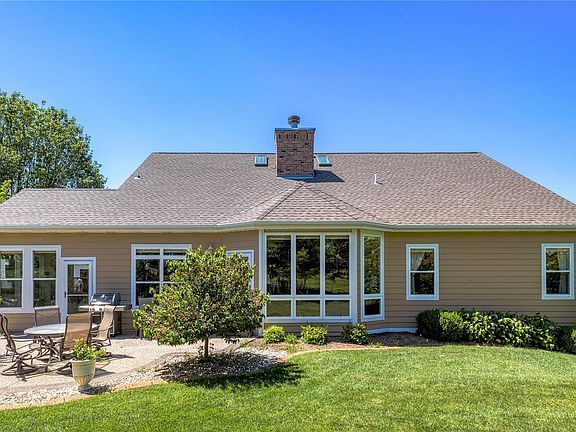 This spacious brick great room ranch features an open floor plan with soaring ceilings, oak hardwoods & detailed trim work. Vaulted entry foyer leads to formal dining room framed by architectural columns & stunning great room with cathedral ceiling, skylights & see-through marble fireplace. Chef’s kitchen with 42” oak Shaker cabinetry, granite countertops & center island adjoins light-filled breakfast room with built-in breakfronts, sun porch & step-down hearth room with fireplace & wide bay window with atrium door that opens to patio. Primary bedroom suite offers an appealing retreat with luxury bath & French doors to hearth room. 2 Additional bedrooms & hall full bath complete the main floor living quarters. Lower Level includes recreation room & game room plus office & full bath. Situated on a private cul-de-sac lot with aggregate patio surrounded by landscaped gardens & 2-car garage. Golf community lifestyle with access to clubhouse, pool, tennis courts & championship golf course.