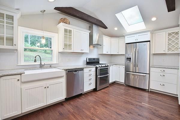 - Kit Dscrp: Flooring - Hardwood, Countertops - Stone/Granite/Solid, Skylight, Open Floor Plan, Recessed Lighting, Slider, Gas Stove, Beadboard, Ceiling - Vaulted