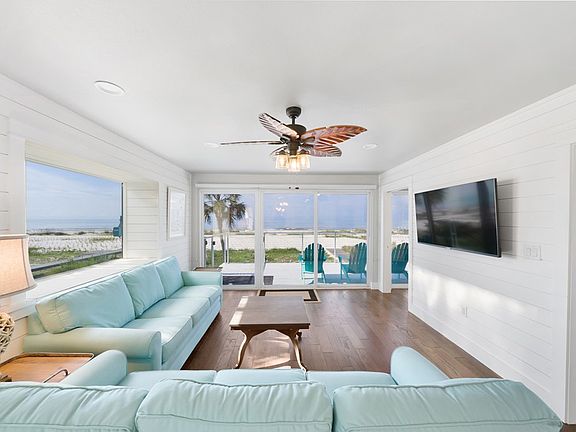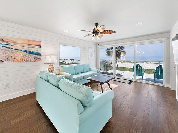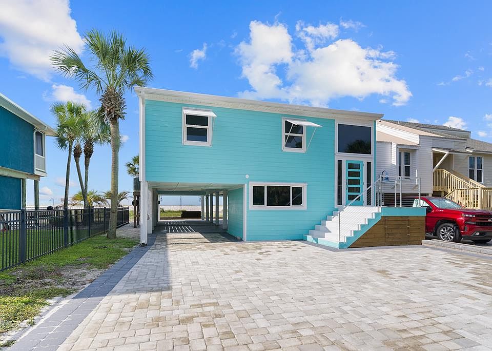 Welcome to your dream beachfront home, a perfect blend of coastal charm and modern luxury. This fully furnished gem is ideal for families seeking a tranquil retreat or investors looking for an exceptional rental property. With approximately 2500 sq ft of living space, this expansive beachfront haven offers five bedrooms, 3.5 bathrooms, a versatile bunk room, and two storage rooms, providing ample space for all your needs. Step inside to discover a home that has been meticulously remodeled from top to bottom, ensuring a move-in-ready experience for you and your loved ones. The open-concept layout allows for seamless flow between the living, dining, and kitchen areas, creating a welcoming space for gatherings and relaxation. The living area boasts sweeping views of the Gulf,, inviting you to unwind while gazing at the endless horizon. High-quality furnishings complement the coastal-inspired decor, allowing you to bask in the ambiance of beach living from the moment you step in. The renovated kitchen is a culinary haven, featuring top-of-the-line appliances, stylish cabinetry, and gorgeous countertops. Whether you're preparing a feast for the family or whipping up quick beachside snacks, this kitchen has everything you need to unleash your inner chef. The spacious bedrooms provide comfort and privacy, with the master suite and two upstairs bedrooms offering direct access to breathtaking beach views. The ensuite bathrooms are elegantly appointed, providing a spa-like experience to indulge in after a day of sun and sand. The bunk room adds versatility and extra sleeping space for guests or younger family members, while the storage rooms are perfect for stowing away all your beach gear, water toys, and additional appliances. Outside, a large shaded area, is perfectly set up for out door entertainments, as well as room under the house to comfortably accommodates two vehicles, protecting them from the elements. Ample parking space allows you to invite all your friends and f