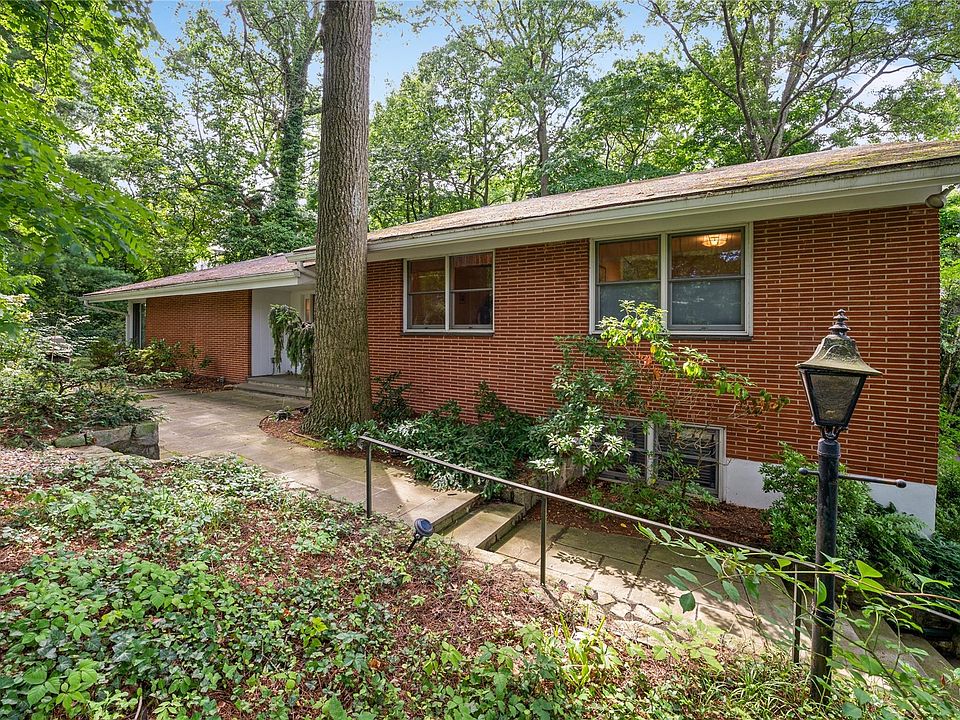 A/O 8/5/25. Mid-century contemporary ranch located in an enchanting setting. A hallmark of this home is the very special living room with a 14 foot cathedral wooden ceiling and magnificent large windows letting in natural light and views of the park-like property. A see-through brick fireplace connects the living room and formal dining room creating wonderful entertaining spaces in an open floor plan. The kitchen is updated with a large island to gather around. A heated sunroom provides amazing views and is a favorite feature year round. There are 3 bedrooms, 2 full baths, a den and plenty of storage. An attached 2 car garage plus driveway parking makes living very convenient. Fabulous location in prime Lawrence Park West neighborhood only a short walk to Sarah Lawrence College and Bronxville Village.