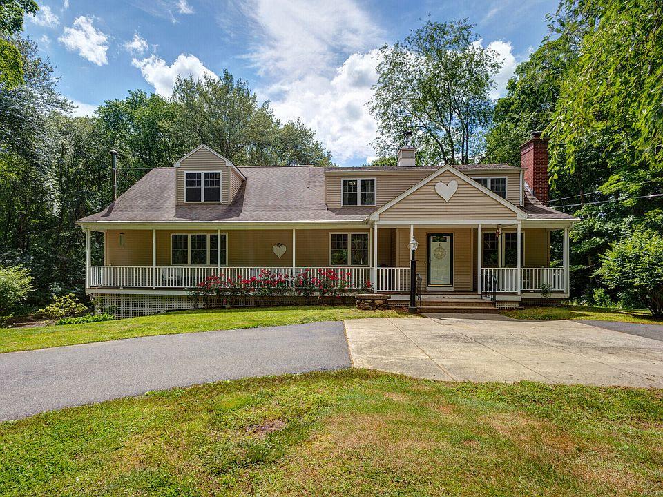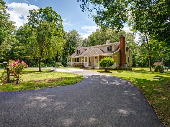Discover your own secluded haven with this expanded Cape Cod home with a wraparound front porch, ideal for unwinding while soaking in the serene sounds of nature. A farmhouse style home with over 3000 SF of living space. Entryway leads to the living room featuring a fireplace with a wood stove insert, while the dining room seamlessly transitions into a spacious family room enhanced by a large bump-out window and a 1900's Glenwood Stove, adaptable for both cooking and heating during chilly winters. The light-filled kitchen offers shiplap and crown molding, a large stainless steel farmhouse sink, granite countertops, stainless steel appliances, a storage cabinet, and a prep station with a bamboo top. Glass doors lead to the upper deck overlooking the backyard. The main level includes a bedroom with full bath access, alongside a versatile second room with its own full bath, suitable for guests or a home office. Upstairs, discover 4 additional bedrooms sharing a hall bath, including the master suite with a dressing room and full bath. This home offers the flexibility of an in-law setup. Nestled on 4.25 acres, the property features a cleared, level backyard with a fire pit and shed, and abuts a brook. Conveniently located near Route 80, enjoy an easy commute to New Haven, Yale, and area attractions. A 10-minute drive takes you to the historic town Green, where you'll enjoy an array of restaurants, boutiques, coffee shops and town beach. Additional amenities include a circular driveway in front, cooling via split systems, Buderus furnace, oversized 2-car garage, and house is equipped with a generator transfer switch. Shed has electric. Homeowner was told by the town that there is room on the property if someone wants to expand or add an ADU (Buyer to perform own due diligence).