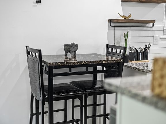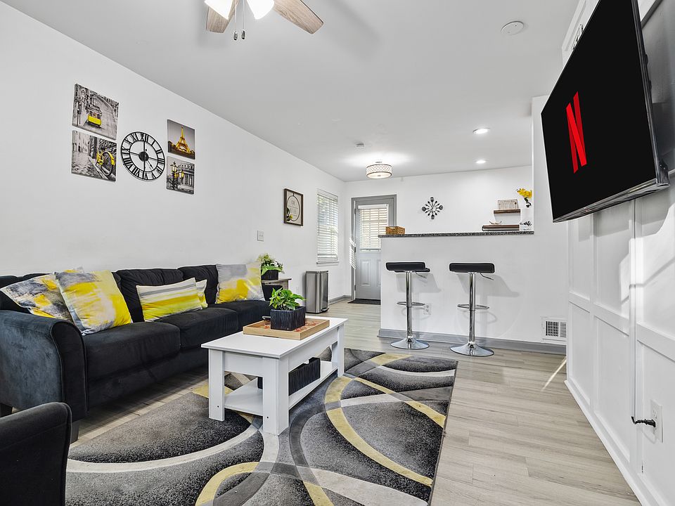Experience the perfect combination of comfort, convenience, and modern elegance in this beautifully remodeled 3-bedroom, 2-bathroom home, located in Atlanta, GA, just 10 minutes from downtown Atlanta. Whether you're visiting for work, family time, or a fun getaway, this property is thoughtfully designed to make your stay warm and inviting. This single-story home features an open-concept living area that seamlessly connects the living room, dining space, and fully equipped kitchen. With stainless steel appliances, including a Keurig coffee maker, toaster, and tea kettle, you'll have everything you need to prepare home-cooked meals for your group. The accommodations include two cozy guest bedrooms, each with Samsung Smart TVs, and a spacious master suite with a luxurious queen-size bed, rainfall shower, and another Samsung Smart TV. All bedrooms are equipped with memory foam mattresses for ultimate comfort, with additional sleeping options available for larger groups. Key Features: Sleeping Arrangements: 1 Queen Bed (sleeps 2), 2 Full Beds (sleeps 2 each), 1 Queen Air Mattress (sleeps 2 best placed in the master or living room) Fully Equipped Kitchen: Stainless steel appliances, cookware, cutlery, and basic cooking essentials (oil, salt & pepper) provided High-Speed Internet: Perfect for streaming, remote work, or staying connected Parking: Two-car carport and a spacious driveway that fits 4-6 vehicles Laundry: Washer and dryer with detergent pods provided for your convenience Living Area: Relax on the comfortable sofa and enjoy your favorite apps on a Samsung Smart TV. The dining table comfortably seats 6, making it ideal for group meals. Strictly no smoking or vaping is allowed inside the property. This home is perfect for families, groups, or corporate stays looking for a comfortable and convenient base in Atlanta. While the home can host up to 8 people, 6 is the ideal group size for maximum comfort. Don't miss the chance to experience this beautiful home just minutes from downtown Atlanta, blending modern elegance with all the comforts of home.