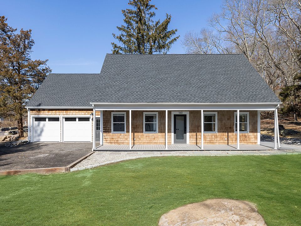 Beautifully remodeled 3 bedroom, 2.5 bathroom Cape home with front farmers porch just outside of downtown Mystic. With just about 2,100 square feet of updated living space and a first floor primary ensuite bathroom there is so much to love. Entering, you are greeted with wide plank white oak floors that span both levels. A large living and dining area with great natural light flows seamlessly into the fully renovated kitchen which leads onto the rear deck where private dining and relaxing can be enjoyed. The first floor bedroom has double closets, a private bath with a large tiled shower and laundry just outside the door. Off the kitchen and garage there is a pantry with a wet bar and beverage cooler that also has space for a mudroom with built-in storage. This leads to an additional room above the garage that can be used for entertaining or additional sleeping. On the second floor you will find two additional bedrooms as well as another full bath with a tiled shower. The two car garage is also home to the Buderus furnace that heats the radiant floors. Ductless units provide air conditioning and supplemental heat. This charming home is nestled on a lightly wooded private lot just outside everything Downtown has to offer and is sure to impress.