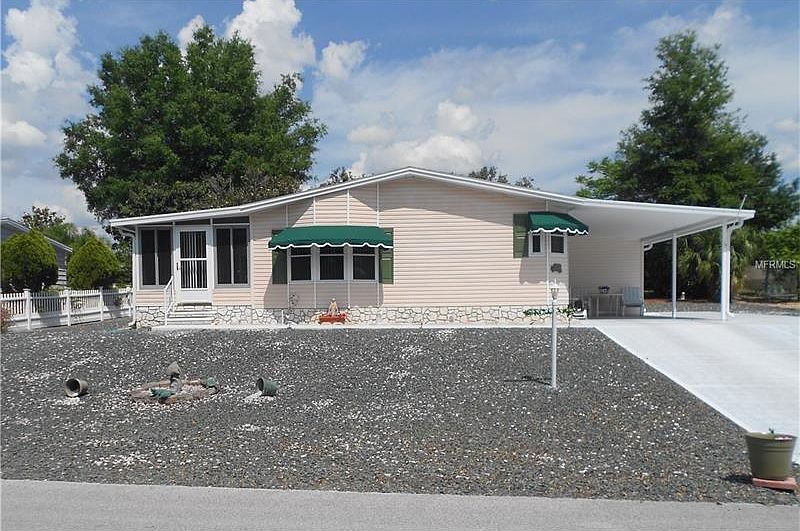 Nice two bed/two bath home in a desirable 55+ community. Open kitchen with smooth top stove, cabinets with pull out shelves, and a breakfast bar. The dining room has a built in cabinet, the living room offers a nice bay window and leads out to the side air conditioned Florida room overlooking the side patio. There are newer windows and laminate flooring, an extended shed, a double tandem driveway, and an easy care home. Polo Park West offers an executive 9 hole golf course, two clubhouses with kitchen facilities, two heated swimming pools, tennis courts, shuffleboard courts, pool tables, exercise room, library, planned activities (such as bingo, arts, crafts, sports), active neighborhood watch & safety program, and tv station with community announcements. LOW HOA FEES.