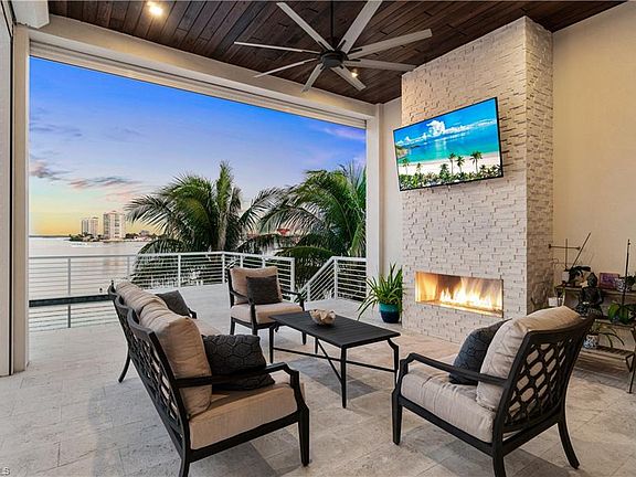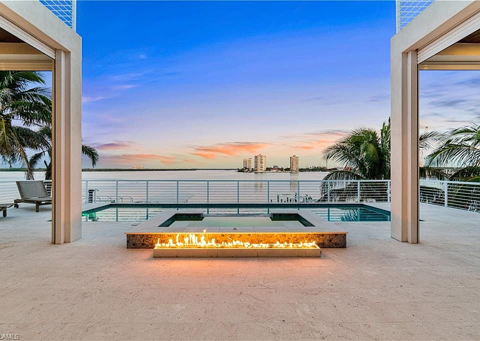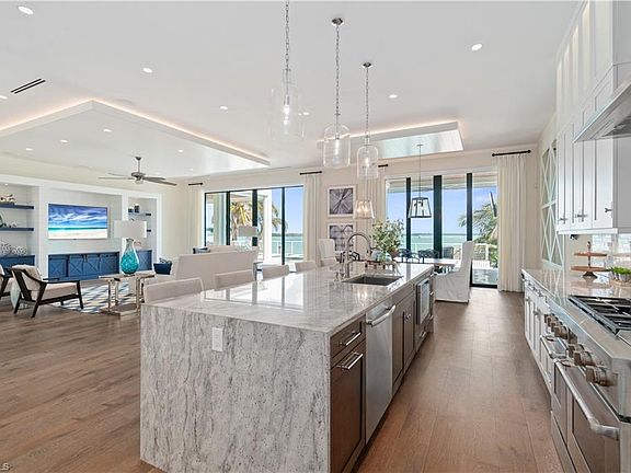 Exceptional 2019-built masterpiece on the coveted South end of Estero Island. Offering some of the most expansive and breathtaking bay views the island has to offer, this residence is the epitome of coastal luxury living. A haven for boating enthusiasts, it boasts direct access to the Gulf with just a two-minute boat ride. The property features a private dock, a 12,000 lb boat lift that previously accommodated a 40-foot boat, and a jet ski lift. Located just a 7-minute (0.3-mile) stroll from deeded beach access exclusive to a limited number of South end bayside residents, this home is perfectly positioned for both beach and boat lovers. No details were overlooked while meticulously crafting this architectural marvel, from beautiful oak flooring to inverted tray ceilings with custom lighting. Inside, the expansive open layout includes 4 spacious bedrooms, 4 full bathrooms, 2 half-baths, dual laundries, and a garage that has ample space for 6+ cars. Step outside to your own backyard oasis, where an expansive pool deck awaits, featuring an elevated pool with a sun shelf, spa, a fireplace, a summer kitchen, a pool bath, and a bar area with swinging chairs and seating – perfect for entertaining or relaxing. The gourmet chef’s kitchen is equipped with high-end granite waterfall countertops, sleek white cabinetry, premium Jenn-Air appliances, and a butler’s pantry. The luxurious primary suite offers sweeping Bay views, a private lanai, dual walk-in closets, and a spa-like bathroom with dual vanities, a freestanding tub, and a shower with multiple shower heads for ultimate relaxation. Additional features include a whole-house filtration system, a 500 lb buried propane tank, a private elevator, hurricane impact windows and sliders, electric storm shutters, interior electric screens, a Lutron lighting system, and a surround sound system. Prime location on a peaceful stretch of South Estero Island close to many fantastic restaurants and easy access to Lovers Key/Bonita Beach. This is the pinnacle of waterfront living.