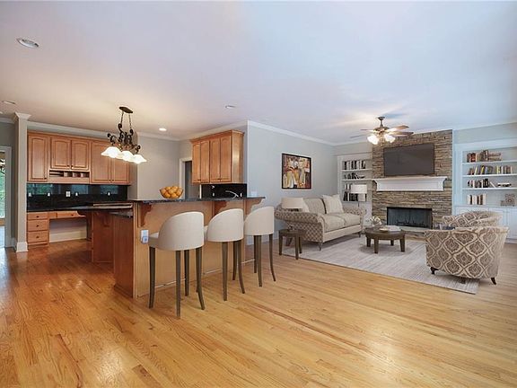 - Kitchen Features: Breakfast Bar, Cabinets Stain, Eat-in Kitchen, Pantry, View to Family Room, Stone Counters, Kitchen Island, Breakfast Room, Keeping Room, Wine Rack