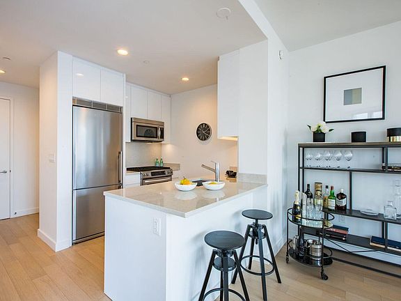 Kitchens are complete with polished Silestone countertops and backsplash, modern bright white custom cabinets, a stainless steel Blomberg refrigerator and Kitchen-Aid Slide in range, dishwasher and microwave. Bathrooms feature a custom walnut vanity, Daltile porcelain tile and unique recessed shower curtain tracks. Select residences also feature a glass enclosed shower. Bosch washers and dryers are offered in all residences throughout the building.