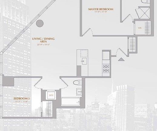 Exceptional triple exposure high floor corner split 2 bedroom, 2 bath home with a pass through kitchen and a wall of windows looking out to the Empire State Building and Midtown Skylines, with sunsets every evening! Master suite features a windowed bathroom with a stall shower and radiant heated floors and washer/dryer in home.