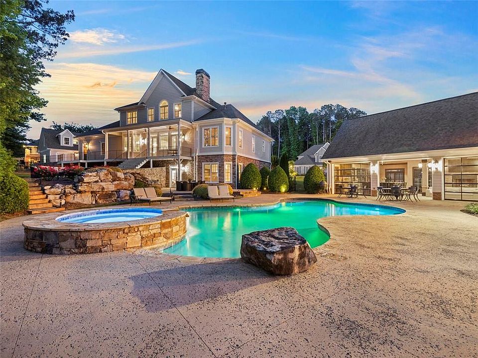 Gorgeous ONE OF A KIND home IN THE GEORGIAN nestled on a Sprawling Estate on a Prestigious 18 HOLE GOLF COURSE on the 13th hole designed by Legendary Golf course Architect TOM FAZIO. This home includes AN AMAZING POOL HOUSE with AN INDOOR BASKETBALL COURT & STATE OF THE ART GOLF SIMULATOR. Did I mention A GUEST HOUSE ENSUITE AND 5 CAR GARAGE. Custom Upgrades in this home are like no other in the Georgian which is built on a DOUBLE LOT!!! Main House greets you with craftsman style architecture and manicured landscaping. This Home features Double foyer and has natural light and Hardwood Flooring throughout. Gorgeous Custom Dining Room with Crown Molding. Across the hall you will find an office with Decorator Paint. Open Family Room with Bookcases, Coffered Ceilings, Cozy Rock Fireplace and Wall of Windows with Gorgeous Views to Golf Course. Back Deck for sipping your coffee in the morning. PRIMARY ON MAIN IS A SUITE which includes Spacious bedroom with his/her walk-in closets. Nice primary bath with double vanities and soaking tub. Upstairs you will find 4 Large Bedrooms 3 Full Baths and a media room for relaxing and sleepovers. Entertainer’s Dream Basement features a large family room with fireplace, 2nd Primary Bedroom with Full Bath, Butler’s Pantry and State of the Art Golf Simulator for rainy days or fun with your favorite guests. Tons of Storage! THE HOME GETS EVEN BETTER-Once you leave Basement to walk out to the Gorgeous Pool with Waterfalls and Breathtaking views to Golf Course, take a few steps to ONE OF A KIND POOLHOUSE WITH MODERN GLASS GARAGE DOORS THAT OPEN FOR ENTERTAINING TO POOL. The Pool house includes GORGEOUS FIREPLACE, SOUND SYSTEM, AND STUNNING KITCHEN with BAR room for Ping Pong and playing cards or just relaxing. Wonderful Full Bath for showers after swimming. Now for the best part-AN UNDERGROUND GYMNASIUM-for Basketball-volleyball-indoor Pickleball or any other indoor sport. THE POOL AREA IS LIKE NO OTHER-TONS OF OUTDOOR ENTERTAINING. THE GROUNDS ARE AMAZING AND THE NEIGHBORHOOD OFFERS SOME AMAZING AMENITIES INCLUDING TENNIS, POOLS, CLUBHOUSE AND RESTAURANT. THERE IS MORE, Guest Apartment over detached garage which includes kitchen and bedroom. You will never have to leave your home with all there is to offer.