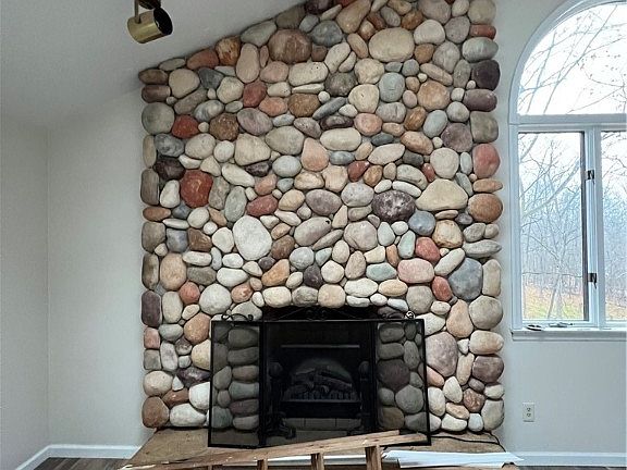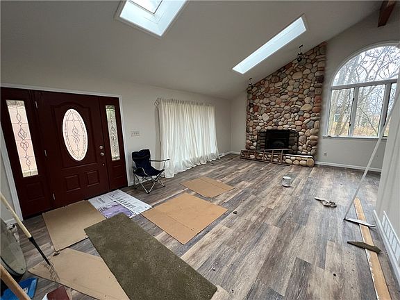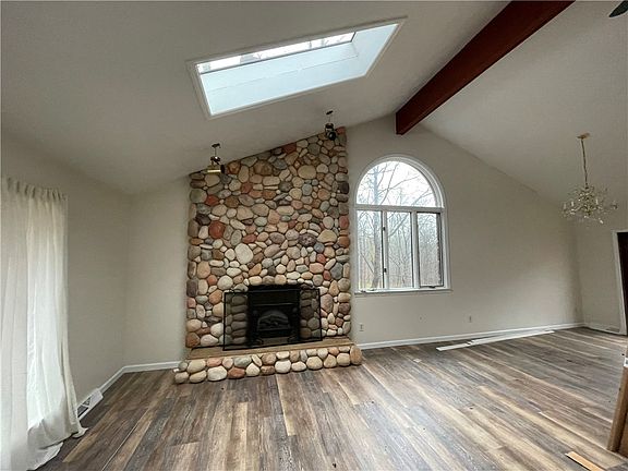 Walk into this beautiful open-concept house. There is plenty of natural lighting with skylights based in a forest like setting. The focal point is a huge stone fireplace made out of river rock. The fireplace could be gas or wood-burning. The kitchen is easy to move about with multiple prep stations and a centered cooktop on the island. It also includes a pantry off of the kitchen. The master bedroom has its own 1/2 bath and really a beautiful view of nature through the windows. In the basement, there is a fourth bedroom/bonus room. There is also a bathroom and a full game room with a wood-burning brick fireplace and a full kitchen in the basement. There is a one-and-a-half-car garage around the back of the house. The house has updated hot water heaters and a furnace. Almost all of the windows are newer. You can easily put a deck off back sit back and enjoy nature.