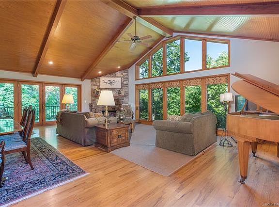 Spacious, open, natural light filled Montreat home with a nice view of the mountains on a relatively large .48 acre lot. The cathedral ceiling, large windows, hardwood floors, and an open floor plan make this mountain home comfortable year round. Enjoy Fall evenings by a fire in the stone fireplace or Summer evenings on the open covered porch with mountain views. Choose between dining inside, or on the screened-in porch, all with high ceilings. The large MBR, with a walk-in closet, BA, and laundry area are on the main level. Central heat and A/C provided by heat pump and fresh air system. Jotul woodstove on lower level for that distinct warmth and ambience of wood heat when you prefer. The lower level also has 3 BR, 1 full bath and 1 half bath, a 2nd laundry area, and a study or 4th BR. Open den area flows into the second kitchen. Carport on main level gives good access, or use 2 car garage (w/separate workshop) on lower level. Close to Flat Creek and walking trails to center of town.