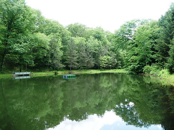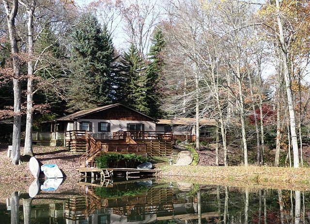 SERENE SETTING! Discover this one-of-a-kind retreat featuring a ranch home overlooking the private stocked lake. Located just off Route 8, this 18.294 acre property offers both wooded places and open spaces! Tall oaks and graceful pines line the winding drive. Cedar shake shingles adorn your chalet in the woods. Main level living includes a formal Living Room with beautiful built-in bookcases and wooden cornice valances. The nearby Dining Room has a half-wall with spindles and charming chandelier. Warm and inviting, the eat-in Kitchen has custom wood cabinetry, wall oven, newer microwave, refrigerator and gas cook top. Enjoy views of the lake from the kitchen window. Main level laundry has a door to the side of the home. Family Room has a fireplace with stone surround. Powder Room is convenient at this end of the sprawling ranch. Enter the 2-car attached garage from the Family Room. At the opposite end of the home, you will find 3 bedrooms. Bedroom 3 has updated neutral carpeting and a triple window. The main hall bath has a full tub/shower and a single sink vanity. Bedroom Two includes wooden cornice valance above the sliding door which opens to the back deck. The Master Suite has neutral carpeting, a private bath and two windows viewing the lake. Another sliding door in the Master Suite opens to the covered portion of the back deck. The expansive back deck wraps around the side of the home to a multi-level deck with large seating area on the main level, then dropping down a 16' wide staircase to the lower deck. Gates open to the docks and to the yard. Enjoy many peaceful moments enjoying the glistening waters and watching the ripples created by the stocked fish. Separate detached garage or workshop with a fenced area beyond is ideal for your home business or hobby. AG-A zoning allows many uses for this building and property. Open, cleared area is suitable for building if desired. Take the Visual Tour online: http://www.visualtour.com/show.asp?T=2535031. Shown by appointment only, call Marlene Sausman at 724-316-7212 for more details on this unique property and arrange for a showing.