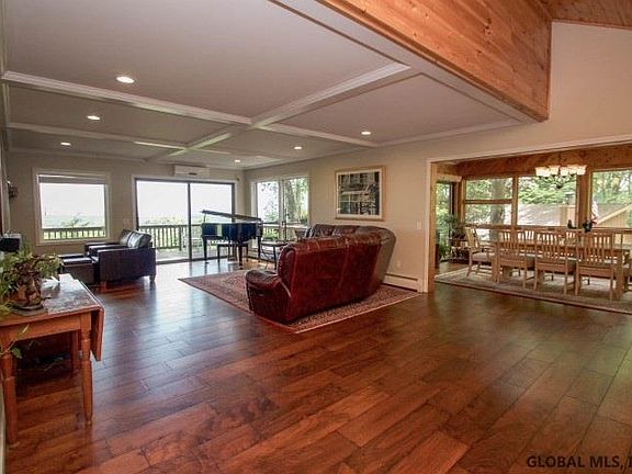 Like Jackson Hole: Ski West Mountain from your front door! One of the best views of the Adirondacks, Green Mountains, Hudson River & Glens Falls from your wrap around deck. This spacious home is perfect for year round use as well as vacation and rental. Views, Views, Views, first floor master, creative architecture, walnut floors, newer kitchen, w/updated appliances, fireplace, outstanding glassed-in Dining Room, 3 full bathrooms, private hot tub room, 2 car garage, separate cottage house w/electric and a huge garage under the building for boat or vehicle storage.