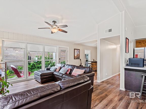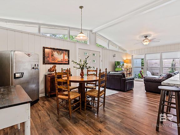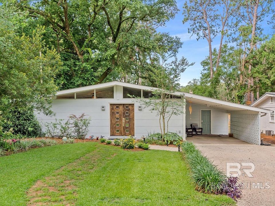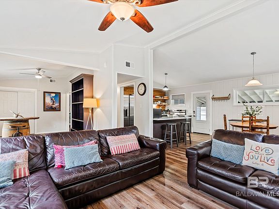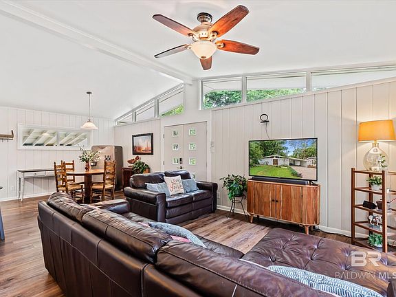 Are you looking for your cozy cottage in Fairhope's Fruit and Nut District? Your search is over! This adorable home in located less than 4 blocks from Magnolia Beach on the Eastern Shore of Mobile Bay and is a short walk to Downtown Fairhope. Inside this home you will find vaulted ceilings and an open floor plan with an abundance of natural light. This home has 2 bedrooms, 1 newly remodeled bathroom, breakfast area and has a flex area that could be converted back into a 3rd bedroom if desired. The remodeled kitchen has granite countertops, an island, and new Samsung appliances (dishwasher and stove are wifi capable). There is new LVP flooring throughout the home. updated vinyl windows, all new fiberglass exterior doors with fingerprint/wifi enabled locks, new HVAC (2022), new electrical wiring (2022), new electric water heater (2022), new gutters and new ceiling insulation beneath the new Fortified Roof (2022). There is a separate laundry/utility room under the carport that attaches to the home. Home has a gas hookup already on the property and has underground utilities in place. Enjoy your days and nights outside on the side patio or on the sizable deck that overlooks the spacious and fully fenced back yard that contains a new storage shed. The front yard has an irrigation system. Call and schedule your showing today! Seller is a licensed Realtor. (ANY/ALL UPDATES ARE PER SELLER). LISTING BROKER MAKES NO REPRESENTATION TO SQUARE FOOTAGE ACCURACY. BUYER TO VERIFY. Buyer to verify all information during due diligence.