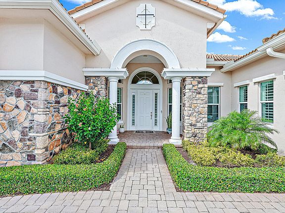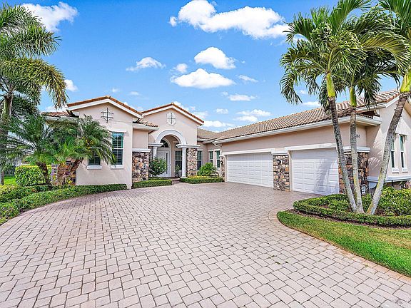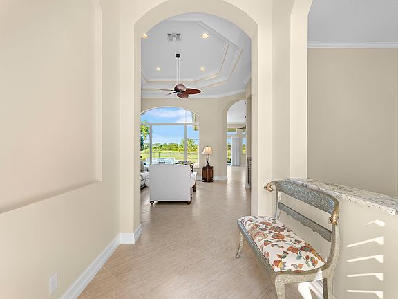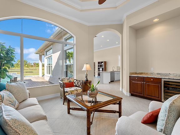 Rare best-selling extended Castania model and largest one-story on the market!!Prepare to be captivated by this exquisite residence in Jupiter Country Club, set against the backdrop of breathtaking golf and lake views.As you step into this remarkable home, you'll be greeted by an elegant seating room designed for entertaining with large open windows and the backyard as your conversation piece. The well-appointed gourmet kitchen leaves no detail overlooked featuring a hooded gas range, custom backsplash, center island, and spacious pantry. The cabinets were just painted white. This culinary haven is perfectly complemented by a sunlit breakfast area and an expansive family room. Sliding glass doors seamlessly connect the indoor and outdoor living spaces, providing direct access to the covered lanai, where alfresco dining and relaxation await.