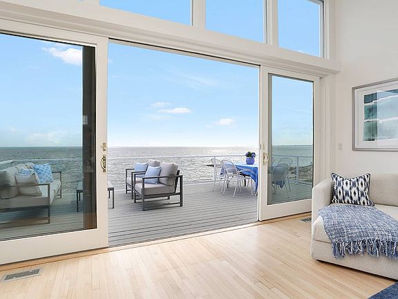 50 ft of rare oceanfront property with unobstructed window-filling views across the peaceful Sound. Faces southwest for spectacular afternoon light and sunsets. Property elevated from shoreline, house close to water's edge for best possible vistas. Only this section of Pine Creek Avenue has comparable ocean views. Timeless, stylish and thoughtful architecture. Casual open layout with soaring ceilings on main level, spectacular for entertaining. Dramatic floor-to-ceiling windows slide open to merge indoor space with outdoors. Immense deck runs full width of house on water side. On opposite side another deck overlooks open field, no house immediately across street. Setting adds tranquility and privacy. Chef-caliber kitchen with custom maple cabinets, soapstone countertop, Viking range. Cozy, spacious bedrooms, 2 baths and laundry room with storage on level beneath. Wake up to ocean views from master suite, step outside onto deck. Master bath with radiant heat floor and steam shower. Outdoor shower beachside. Private roof deck with hot tub offers 360-degree panorama. FEMA compliant, beautiful and practical construction with house elevated on piers. A slice of heaven--moments from restaurants and shopping in downtown Fairfield!