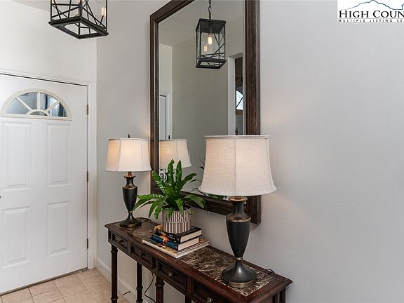 BIG VIEW STUNNING DESIGNER CONDO JUST BLOCKS FROM THE HEART OF BLOWING ROCK! Location! Location! Location! describes the setting of this recently updated, three-bedroom, two-bath condominium. The condominium has been reimagined for 21st century living. New upscale furnishings have been combined with traditional to create an eclectic and appealing milieu. From the great room, you can look across the deck to the Blue Ridge Mountains and the John's River Gorge. With a single step up from the front door, enter the foyer with its large mirror and table. Look ahead to the great room with sliding glass doors to the deck and mountain views. To your right is the kitchen with new quartz countertops, paint and hardware. Pass into the great room by the exciting round metal dining table and upholstered chairs with round mirror above. Enter the seating area with a quilted leather sofa, leather swivel chair and twin plaid armchairs. Over the stone fireplace with propane logs is a flat-screen TV. A special decorative console highlights the cozy area for conversation and viewing. The primary bedroom with mountain views has an elegant king canopy bed, a walk-in closet and a bath with large shower and new marble top vanity. A second bedroom opens off the hall with upholstered twin beds and charming handcrafted bureau. Next to this room is a bath with porcelain whirlpool tub and shower, and new vanity with marble countertop. The third bedroom and den has a pullout queen sofa and console for a TV. A gorgeous wooden floor was installed in the great room and hall. The condominium was painted all over in November 2023. There are wooden plantation blinds throughout. All furnishings convey except four decorative items. It is move-in ready for owners who like sophisticated mountain living, The unobstructed view is a vacant lot that is not owned by the sellers. There is ample parking in the well-landscaped common area. A lovely sophisticated home in which to enjoy the High Country.