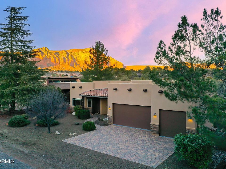 Discover the comfort of owning a home in the peaceful surroundings of the Village of Oak Creek! This 2014 Southwest-style home features a split floorplan with an 11-foot ceiling in the living area- 3 bedrooms, 2 full baths, and a 3-car sealed garage. The master suite features a large walk-in closet, jetted tub & separate shower. The entrance, marked by a paver driveway and walkway, leads to a welcoming great room with a beehive fireplace connected to a functional kitchen offering ample cabinet space, a large granite island, and stainless appliances, including a 5-burner gas stove with a vent hood. The spacious dining area complements the kitchen and great room, creating a pleasant space for entertaining. Step into the large fenced backyard with low-maintenance landscaping and views of Courthouse Mesa. Enjoy the ever-changing red rock scenery through the windows, with Munds Mountain Wilderness to the east, all within the charming Village of Oak Creek, offering a blend of nature and town amenities.