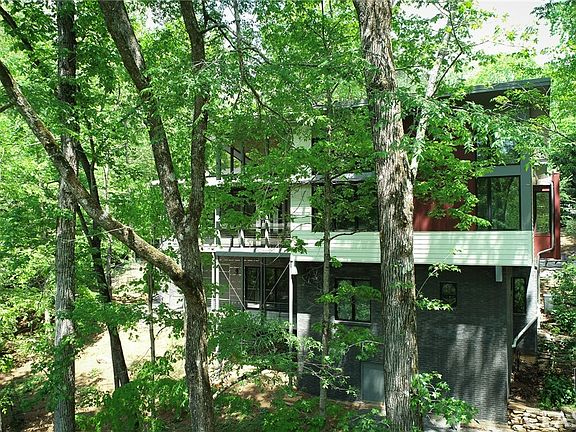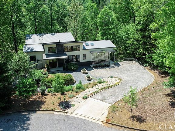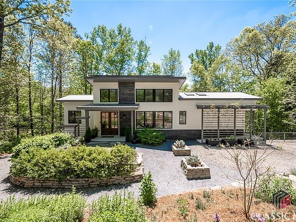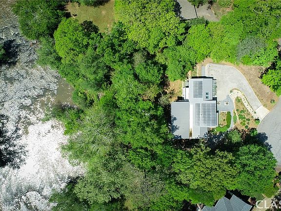 Sitting on a wooded hillside above the North Oconee River is a stunning, Earthcraft certified home designed by award winning local architect Lori Bork Newcomer. Sustainability and a goal of creating a dwelling in harmony with its setting were guiding principles for this custom home. With ceilings that soar as high as 16', the home features an abundance of windows throughout, producing a light filled home while capturing views of the river, pollinator gardens, and a profusion of trees. Entering the foyer you see an art wall and a waist high bookcase running the length of the open staircase leading to the lower level. The main floor features an open concept floor plan with a large living room, highlighted by a gas fireplace with a blue-gray quartzite surround running to the ceiling. The cook's kitchen, complete with large pantry and ample storage, was designed for aging in place and features double wall ovens, quartz countertops and a marble backsplash as well as two solar powered skylights. The living room and dining room open onto a large screened porch (including a gas fireplace) overlooking the river as well as an additional deck. The primary suite is on the main level and includes a wall of windows looking out to the river, French doors onto the screened porch, two large walk-in closets, and two bathrooms. One bathroom is designed with a curbless shower that can accommodate a wheelchair and features a floor to ceiling window overlooking the river. The second, expansive bathroom has large windows on two sides, framing a soaking tub, providing a beautiful view of the river from the tub and stall shower.