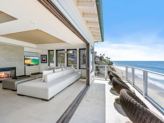 This magnificent oceanfront property designed by prestigious architect Paul McLean and masterfully built by Gallo Builders is truly one of Laguna Beach's finest! Nestled on a bluff overlooking the Pacific on one of Laguna's finest beaches, you will enjoy views of Catalina and yearly sunsets, walks on the beach and the best surf beach in town to learn . Each level's floor to ceiling walls of folding glass and mahogany doors open to beach front patios creating breathtaking indoor/outdoor spaces to enjoy sea breezes, the sparkling ocean, sunset and Catalina views. Limestone floors on every level and patio along with mahogany windows and doors create a soft contemporary design and remarkably comfortable living space. The property has a total of 4 luxurious units and all designer finished with 2 to 4 bedrooms), multiple deck levels ( 1-2 per unit) with bbq, al fresco dining and lounging areas, fireplaces (b, c & d), air conditioning and in unit laundry. Plenty of room for multi-generation extended family gatherings! An extremely unique amenity is parking . A subterranean garage has up to 8 parking spaces ( shared between 3 units a, b & c), upper garage has 2 spaces and there are 2 driveway spaces. The location of this trophy property provides access to absolutely ALL Laguna Beach has to offer. Enjoy walks along the water's edge or the close proximity to Laguna village means a short walk to restaurants, shops and art galleries. This luxurious property can never be duplicated . THE PROPERTY IS FULLY FURNISHED,RATE SHOWN IS FOR THE A UNIT OFF SEASON.