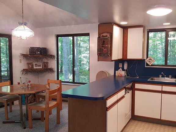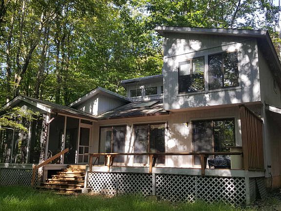 Fantastic location by Pines Lake in the amenity filled community of Locust Lake Village! Fully furnished, 4 bedroom, 2 bathroom Contemporary home with carport and great backyard. This home features a 2 story fireplace with efficient wood stove, open floor plan, 2 bedrooms on the 1st floor including the Master with sliding doors to the large deck space, 2 bedrooms on the 2nd floor, and great screened in porch area. All of this house for a fantastic price!!! Grab this home in time to enjoy the beautiful fall Pocono scenery and skiing season!