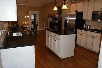 The Ultimate Kitchen is complete with a work island at this Tudor 3064-SF home in Madison. Great features include 5 bedrooms, 3 bathrooms, striking dining room, master suite with separate shower, dramatic living room with fireplace for winter days, beautiful hardwood floors, cozy gathering room off the kitchen, bonus room upstairs and screened in porch!