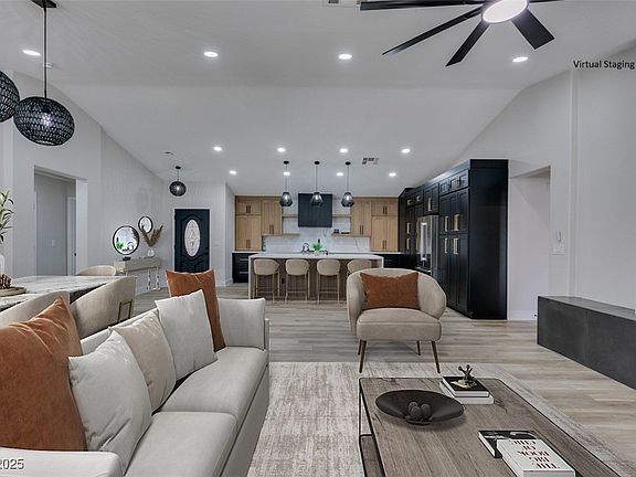 Unicorn in the heart of Summerlin! Single Story, 3 Car Garage with a pool. Vaulted ceilings throughout, luxury vinyl plank flooring, perfect for handling family pool parties. The gourmet kitchen is a chef's dream, Built in 60" Referigerator, 36" Professional Range and built in microwave and a custom wrapped hood. Striking waterfalled Calcutta island. Custom white oak and matte black cabinets throughout the house with a hideaway pantry door entry to laundry room/garage. Accented fireplace with slabbed porcelain calcutta, 60" electric fireplace. Both bathrooms remodeled with slabbed Calcutta, accent walls, while the bathroom features freestanding tub, frameless shower glass. Slider door entry to backyard. Covered patio spanning the back of the house ideal entertaining. Pebbletech pool with pop ups. Synthetic Turf, new landscaping.