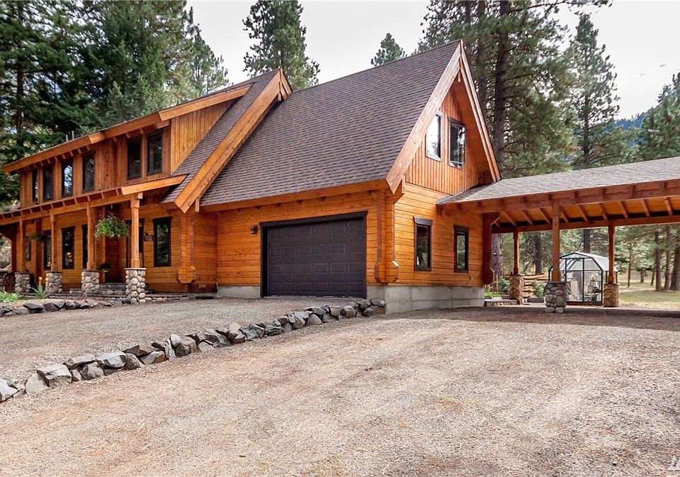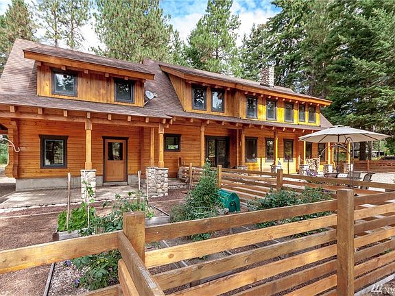Stunning custom crafted builders own log home set on 3 plus acres. A true piece of art. Building costs approx 20% more than stick built. Exposed beams, vaulted ceilings, floor to ceiling rock wood fireplace, fir floors, slab granite, 2 fireplaces, one in the master. Enormous rec room/game room or media room upstairs. The den has built in cabinets. Backyard has large trees & tons of open grassy areas. Garage plus carport & storage shed. Great vacation rental opportunity. Close to the Sno Park