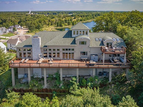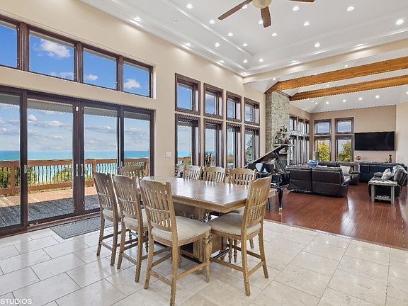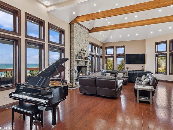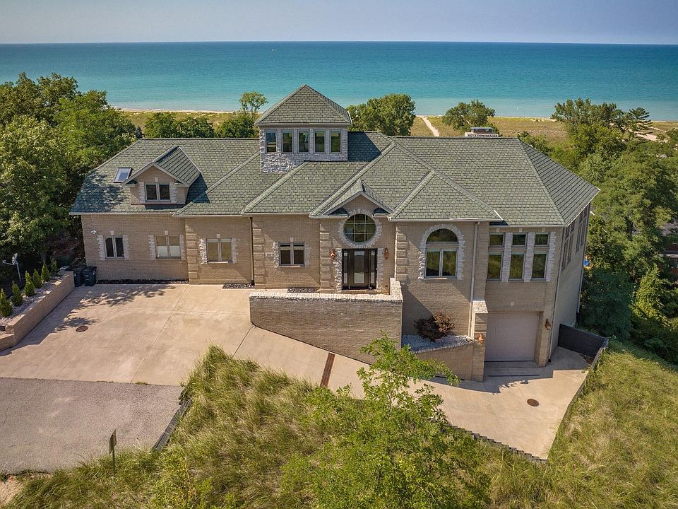 THE best panoramic views of Lake Michigan reside right here in this luxurious brick home atop of the dunes in Sheridan Beach. Overlook Lake Michigan, Lake Kai, natural foredunes, and beach community as a whole from one of the highest points found by the water. 5 Bedrooms, 4.5 Bathrooms and completely open concept w/ massive vaulted ceilings, exposed beams, large picture windows, and a floor-to-ceiling stone fireplace. Breathtaking views from every square inch. Kitchen includes high-end appliances, granite countertops, and pristine custom cherry cabinetry. Bamboo flooring blended with travertine throughout. Primary Suite includes balcony, 2 walk-in closets, and huge en-suite Bathroom with both a double jetted tub and large standing shower. 100 ft. deck with double sliding glass doors provide completely unobstructed views.Massive 8+ car garage with an additional Bathroom, Laundry, home elevator, and bar. Heating driveway and garage floors. Luxury at it's finest!