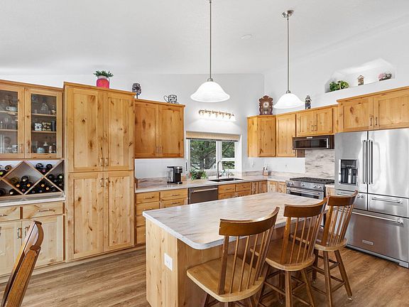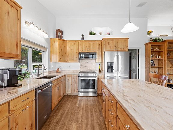 Wonderful warm, & well-maintained home with beautiful mountain views on 1-acre that features a new enclosed porch & deck, RV parking with full-hookups & a new metal roof, & a feeling of rural living in town. Inside you'll notice pride of ownership, fantastic custom Alder cabinets and solid surface counters in the kitchen & baths, and vaulted ceilings & a propane woodstove that unifies the great room, kitchen, & dining area. The main suite is separated from the other bedrooms you'll find a private office in the garage. Outside there is a 2-car garage with plenty of storage, a complete water filtration system, generator hook-up, & a circle driveway that accesses the covered portico for more parking. The RV parking will accommodate any sized RV and there is a smaller newly fenced area & extra storage in the shed. Come see this truly turn-key home today!