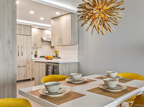 Truly turnkey in custom contemporary design work throughout w/furnishings. Floor was floated to incorporate the lanai of an already luxuriously spacious living area. Favored floor plan w/split bedroom suites on the front side ensures endless ocean views and stunning sunsets from all rooms. Extraordinary, fabulous lighting complements designer neutral tones in quartz countertops & backsplash, stainless steel gas range, dishwasher & French-door refrigerator. New fixtures, new windows, new cabinetry including appliance garages and custom closet systems. Auto sunscreen shades, Central Air, private washer/dryer, security, guest parking, commercial salon exudes all the comforts and rich finishes a homeowner would expect. Benefits of a convenient community lifestyle w/generous amenities including heated pool, private party areas, pickle ball & tennis court just steps to sandy beach, Ala Moana Shopping Center, Park & Waikiki Yacht Club. Flexible