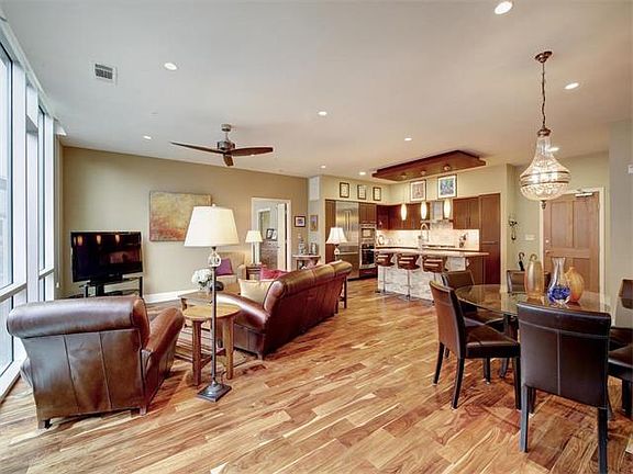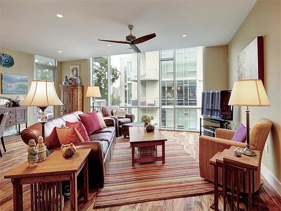 Rare 3BR plan @ Barton Place! Beautifully updated w/ Acacia hardwood floors throughout (except 2 guest BR), limestone accent wall, California Closets in all bedrooms. 3rd bedroom w/ Murphy bed and Murphy "desk" offers awesome flexibility! SS Bosch appliances incl. built-in refrigerator & warming drawer. Bosch washer/dryer convey! Best of Downtown & South Austin life- walk or bike to amazing restaurants & parks, walk to the Zach, or enjoy the trail. 2 balconies, 2 parking spots by the elevator. AWESOME!