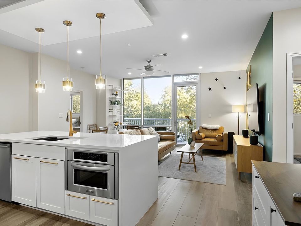 The Jewel at Barton Place earns its name the moment you step inside. The heart of this home — a brilliantly redesigned, brass-accented kitchen — is the showpiece that sets this residence apart. A modern gem, it anchors the entire living space with warmth, sophistication, and a level of detail rarely found at this price point. Located just steps from the Butler Hike and Bike Trail, this 2-bed, 2-bath condo delivers the kind of Austin living people wish for: a private perch surrounded by trees with the city’s best dining and entertainment minutes away. A coveted east-facing balcony tucked into the canopy sets the tone. From the sun-drenched living room, views of the trail and treetops frame the warm, inviting space. Inside, every detail feels intentional, from smart-home lighting to contemporary fixtures and updated hardwood-style LVP flooring. The kitchen features a waterfall quartz island with deep seating, professionally refinished two-tone cabinetry, brass hardware, a metallic honeycomb backsplash, under-cabinet lighting, a Kraus Workstation sink, and stainless appliances, including a gas range and vent hood. The dining and living areas flow easily around the island, creating a bright, social layout. A newer stacked LG washer and dryer and an updated water heater add everyday convenience. The primary suite feels calm and welcoming with designer paint tones, blackout roller shades, and an ensuite bath with a dual vanity, walk-in shower, and deep soaking tub. The second bedroom works perfectly for guests or a home office. Barton Place elevates daily living with a saltwater pool, fitness center, community garden, rooftop terraces, concierge, and secure underground parking (two large side-by-side spots). The guest suite and gym are conveniently one flight down, and an Urban Storage Unit is included. Modern, connected, and surrounded by nature — The Jewel at Barton Place is a rare find above the trees.