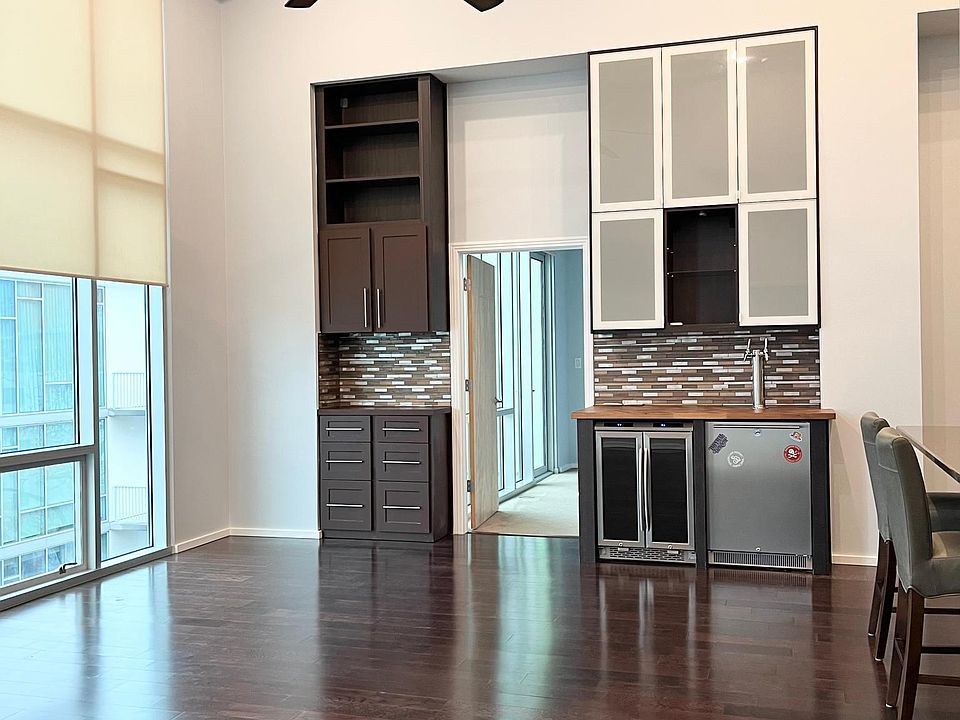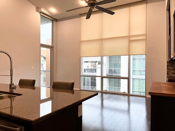 Top floor penthouse unit, 16' ceilings, 2 bedroom, 2 bath, 2 balconies, 2 parking spaces. Interior garden and poolside view. High end condo with access to Barton Springs "restaurant row." Direct trail access to Lady Bird Lake. Gorgeous master shower and soaker tub combo. Floor to ceiling windows, remote controlled blinds. Wine and beer keg refrigerators. No neighbor on one side or above. Green Building Certified energy efficient construction with double insulated low E windows. Conveniently located next to roof top terrace.