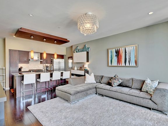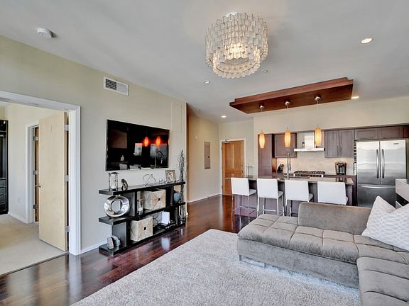TOP FLOOR UNIT = Highest ceilings! Overlooks the zen courtyard, full glass wall at master. Stainless steel appliances, gas range, exterior venting range hood. Granite counters throughout, wood flooring at kitchen and living, travertine baths. Amenities include a heated saltwater pool, fitness center, 4 rooftop decks w/ gas grills, guest suite, fenced in dog run, community garden and private gated parking garage below the building.