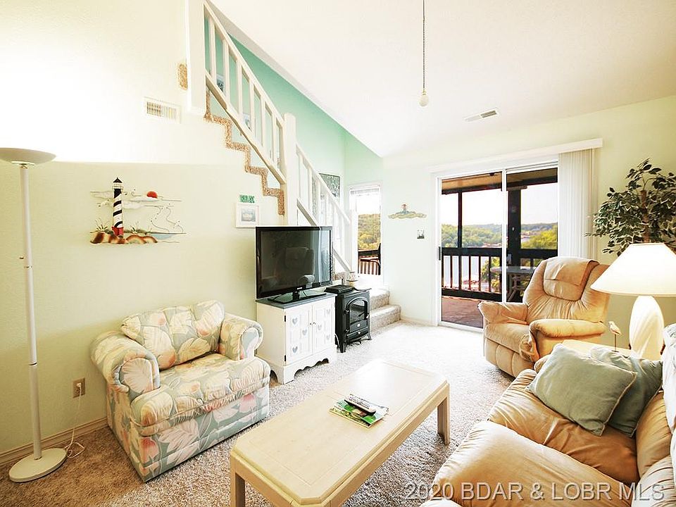 If you are looking for a great get-a-way where you can enjoy peace and quiet, this is the place! 11 acre development with just 8 buildings offers tranquility unlike most other condominium developments. Restricted from nightly rentals, gives owners the assurance that they will hear the birds singing and not their neighbors commotion! Lovely view, screened and open deck, upper level second bedroom suite offer privacy for your guests and a lot of sleeping room, if desired. Great location just 10 minutes from town and at the 4 mile marker of the main lake. Basic furniture package according to inventory list is included. The boat slip has a 24 foot finger on one side and 28 foot finger on the other side. The roof of the dock could be extended if desired. Wildlife abounds. Get ready for Ozark living today!