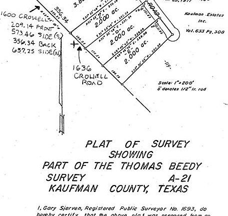 Quiet, peaceful, secluded country living on dead end road! Platted subdivision. Under market! Small acreage just outside city limits--NO restrictions Horses ok! Approx 1.5 miles E of downtown Kaufman across hwy from Kaufman Lake. 16 mi to Cedar Creek Lake Good frontage on asphalt road. 209.14 x 573.46 x 356.34 x 637.25 Existing mobile home burned. Has concrete septic tank, electrical pole, buried water line. Mix of custom built and mobile homes. 1636 Crowell, next door w 2 acres sold for close to land value at $57k ($28,500 per acre). Build or choose your own mobile home today and roll into loan! Conventional & FHA(w home) or VA. Seller can take back 2nd lien if necessary.