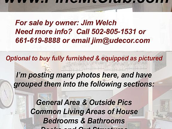 THIS PROPERTY HAS A SALE PENDING AND IN AN ACTIVE ESCROW For Sale By Owner - Contact me directly at 502-805-1531 This was our perfect weekend home, one hour from our home in Bakersfield. Purchased brand new in 2008, 3 bedrooms, 3 full baths, After buying from builder, we added large decks, storage room, covered rear storage with skylights. carport, and professionally converted the garage. Why we are selling: We transferred to Louisville, KY and it no longer makes sense for us to keep. Selling empty or completely furnished. there is a lot of art and it is superbly furnished as shown in the photos (only reserving the arrowhead collections). I'm sure I have at least $50,000 in furnishings and art, but will add $20,000 to sales price if you wish it completely furnished (see list of what's included at www.PineMtClub.com).