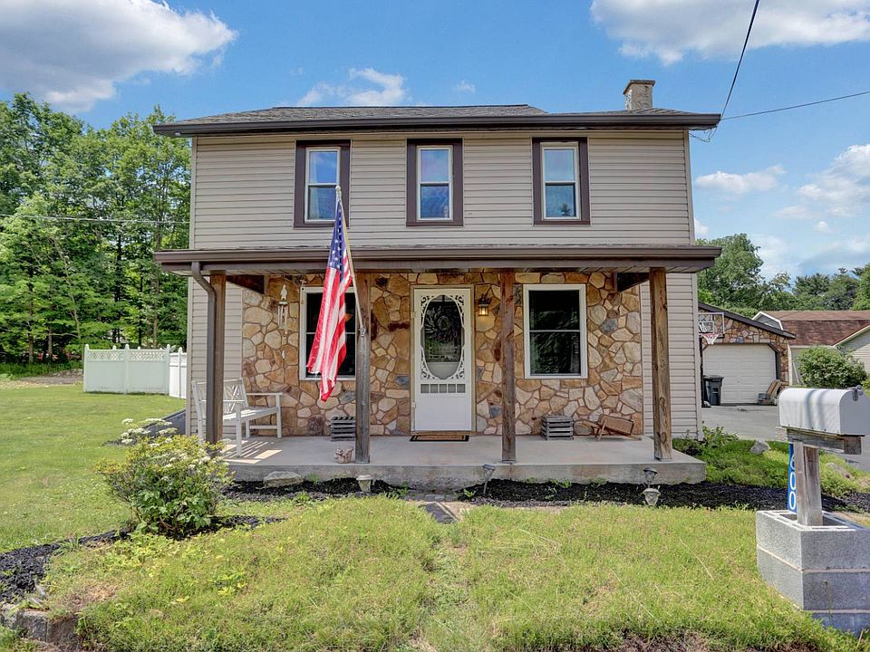 Welcome to this light and bright home nestled in Mill Hall featuring 3 bedrooms, 1 bath, and over 1,300 square feet of living space. The main floor boasts a sun-soaked great room featuring vaulted ceilings, a wall of windows overlooking the in-ground pool, and a floor-to-ceiling stone wall with a gas stove. The kitchen offers ample cabinet space and overlooks both the great room and dining room! Upstairs you can find three generous-sized bedrooms and a full bath. Enjoy summer days hanging out in the 18x32 in-ground pool or around the patio area complete with a cozy fireplace. The 24x53 garage/workshop is the perfect place to practice your favorite hobbies and store all of your belongings! This home is an absolute must-see!