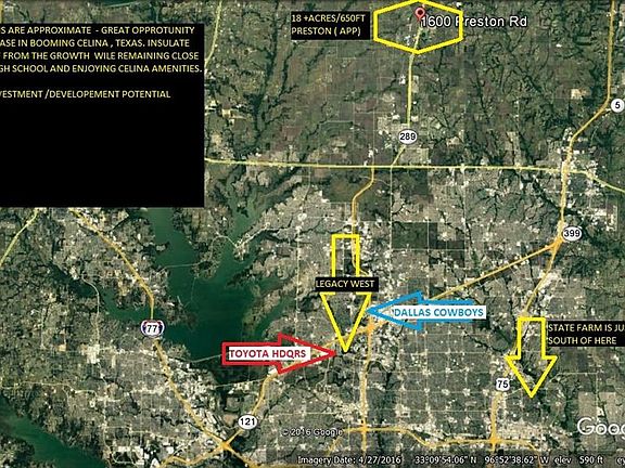18+ acre Ranch with app 650 feet of Preston Frontage. Median cut to provide easy access in or out. 1000 foot deep well provides water to powered barn , pool and 38 zone sprinkler system. Extensive updates to property and house including granite, high end appliances, Pella windows and doors and much more! Easy access to Toyota and Dallas Cowboys new headquarters. Minutes to Celina High School. Property is ideal as a buy and hold investment or development opportunity.