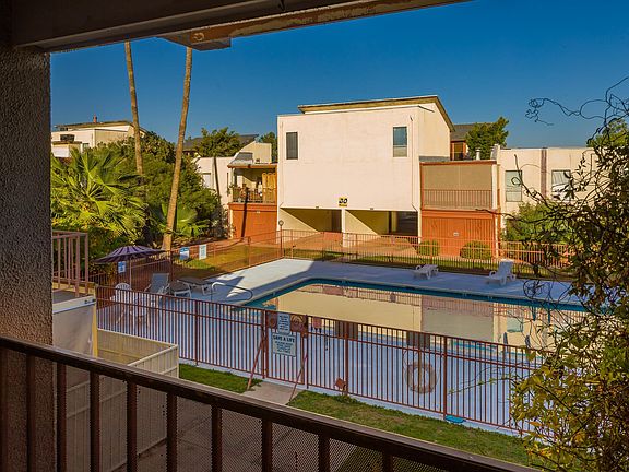 Awesome location and access. This unit is one of Las Colinas most popular models. This unit also is at the end of building so only one neighbor. Covered Parking directly in front of unit. Everyone loves that. Two patios, one downstairs as patio and one balcony. Both overlook refreshing resurfaced pool. Bedroom is downstairs and offers full bathroom with tub and huge closet. Ceiling fans, one upstairs and one downstairs too. Nice kitchen with white cabinetry and built in microwave. Refrigerator stays as bonus. Kitchen has breakfast bar with ample cabinetry. Nice tile flooring and some carpet. Great views from two patios. Really unique, your buyer will love it.