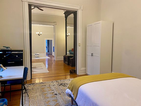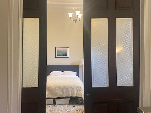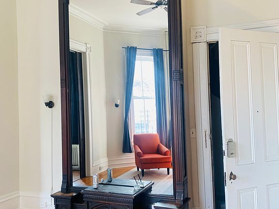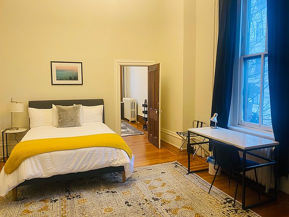 Enjoy this fully furnished 1st floor apt in a historical Bolton Hill home in prime location and overlooking Park median with fountains! Huge original mirrors, pocket doors, and grand foyer. End of row building with a lot of light. 1) 2 Bedrooms with queen beds, wardrobes, desk, chair and lamps. 2) Two large living and lounging spaces. 3) Full bathroom with tub 4) Kitchen with dining nook and built in bench. Kitchen fully equipped. Option for shorter lease of 90 days or more. Length of stay negotiable. Washer and dryer shared on the 2nd floor, but hook ups available if tenant wishes to bring in own. There are 2 other apartments in building and ground floor apartment below with separate entrance. * Utilities stipend of $200/month for water, electricity and internet * Require credit score 620 & no prior evictions. * Total gross monthly salary should be 3x monthly rent