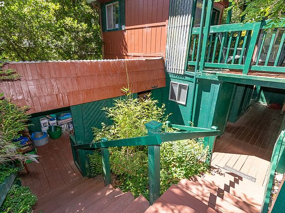 Truly one of a kind "Tree House" on private cul-de-sac lot with so much to offer. Open singlewide with extension 2 bed/2 bath, with enclosed light & bright sunroom; 2 sliders extend to covered decks; sundeck off kitchen all ready to enjoy outside living. 2 story outbuilding attached by covered decking; office (11.5 x 11.5) open potting shed (9 x 13.6); plus storage unit. Dbl carport w/RV connections. New roof & skylights on home 2022. Tie downs & Engineering report completed.