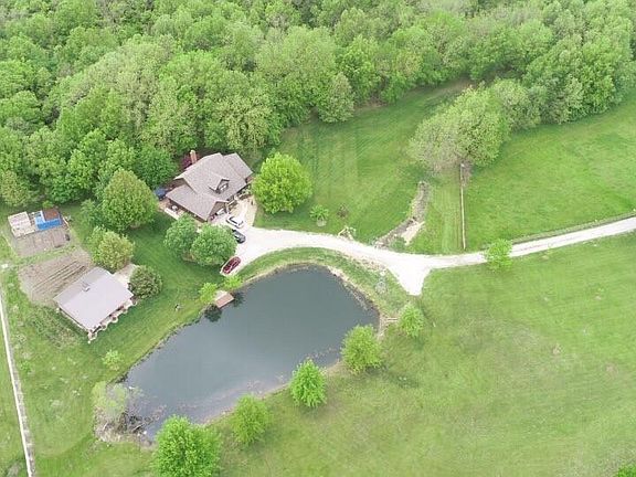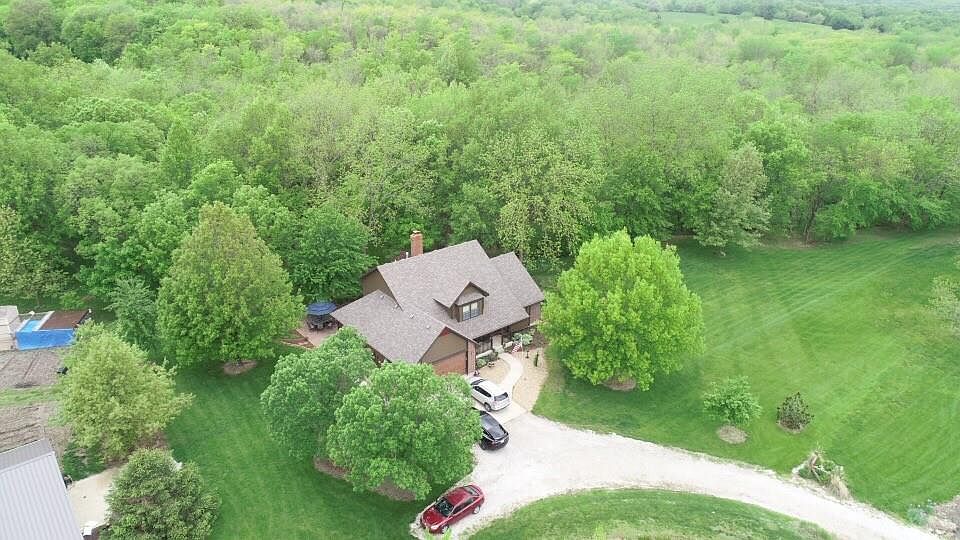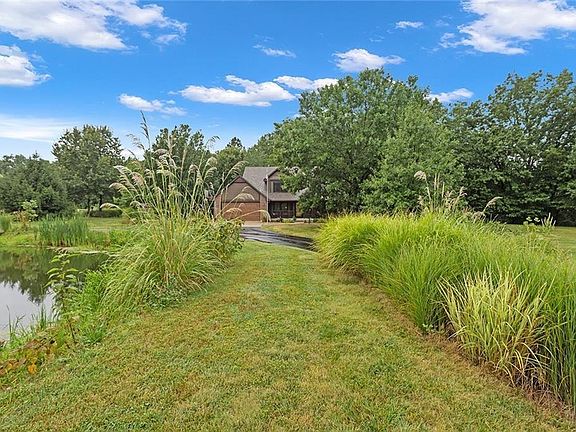 Amazing 12.25 Acre Estate Boasts Stunning 1.5 Story/ Ranch Reverse Home & Heated Outbuilding w/ Electricity Plus Pristine Windmill Aerated Bass Stocked Pond! Property is on GAS - Not Propane!! All New Anderson Windows & Sliding Glass Doors ($40K). Newly Remodeled Master Bath ($20K). K-Guard Gutters Installed 4 Years Ago, and Have Lifetime Warranty! Gardener's Delight with Extensive Perennials & Fruit Trees. Enjoy Fishing, Hunting in the 6 Acres of Timbers, Hiking & 3 Shallow Creeks on Property for Family Fun! Home is Set Back from the Street & Upon Entering the New $23K Winding Driveway, You Will Be Transfixed By the Beauty & Serenity of the Panoramic Views All Around You. This Custom Built Home Has Been Meticulously Maintained By Original Owners & Shows Like New! Beautiful Hardwoods & New Carpet in All BR's. Showstopping 2 Story Great RM w/ Brick Fireplace to Ceiling is Open to Kitchen & Eating Area. Formal Din RM Being Used as Sitting RM. MBR on Main Fl Plus 2 BR's Up. Finished Walkout LL w/ Fam RM Area, Exercise Area, Pool Table/ Game Area, Saferoom, Storage & Potential 4th BR Walks Out to Large Patio. Chicken Shed & Chickens on Property. Large 24 X 32 Outbuilding for Garage or Workshop w/ Covered Front Porch. Only 20 Min Drive to Downtown KC! Property on 2 Parcels.