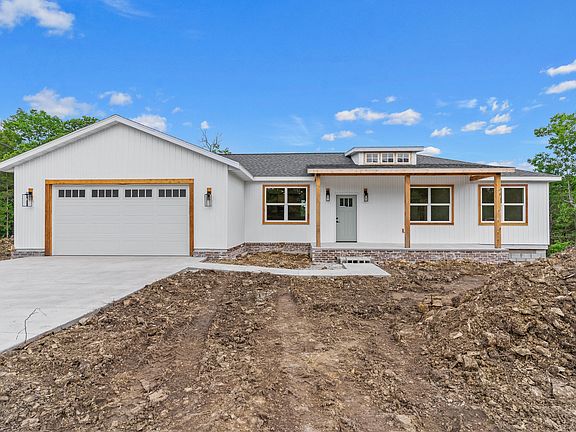 Brand new construction, 4 Bedroom, one-story home on 3.31 secluded acres that is just a golf-cart ride away from the lake. Open-concept floorplan home with 9'' ceilings and wood flooring through-out. Bright and airy, every room features fantastic views out of every window. Large kitchen has an island with beautiful quartz countertops. Large dining room, and cozy family room for gatherings. Primary bedroom has en-suite with walk-in shower, private wash closet and soaking tub. Covered front porch and nice back deck. 8' TALL Garage doors, to park you truck! Private septic and well. Plenty of room to build a shop! Lake access is just down the paved road, on a dead-end street and has a boat launch cove/area. Branson Landing is a short 15 minutes away and highschool is SCHOOL CHOICE. Drury Mincy Conservation is just down the road and features wonderful hiking trails and more! GREAT DEAL.