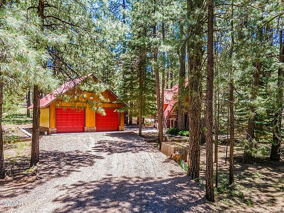 The Best Lot in Forest Lakes & The Cabin With Everything! This very special 1.06 acre property is tucked away at the end of a private cul-de-sac and adjoins the Sitgreaves National Forest. With an amazing 370' of forest frontage this is one of the most coveted lots in Forest Lakes. A custom Cabin with a big 2-story detached garage with guest quarters and an extra bathroom and laundry checks all the boxes. This custom A-frame cabin in the cool Ponderosa Pines is special. The main cabin is the perfect place to gather with friends and family offering a private bedroom (king bed), guest loft (3 queen beds), and the recently renovated bathroom and a full size laundry suite. Also in the main cabin is a full kitchen, spacious dining area and cozy living room with a wood burning stove... Need more space? The guest quarters above the garage (2 king beds) has a private entrance and plenty of room to play and sleep extra guests. The garage also includes a secondary bathroom and a second full size laundry suite.